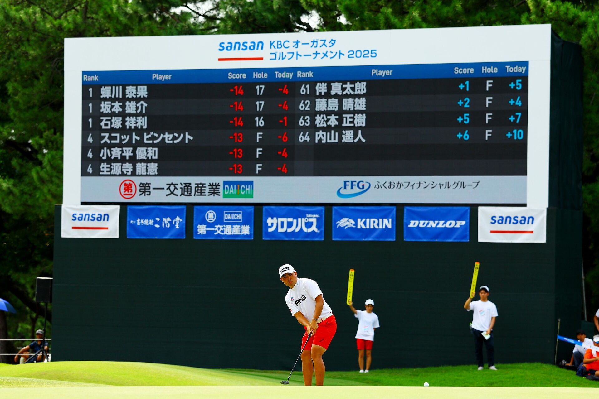 Meanwhile, Ishizuka, who led by three shots at the start of the round, was relieved to be able to hold onto his position atop the leaderboard after enduring a nervous round.