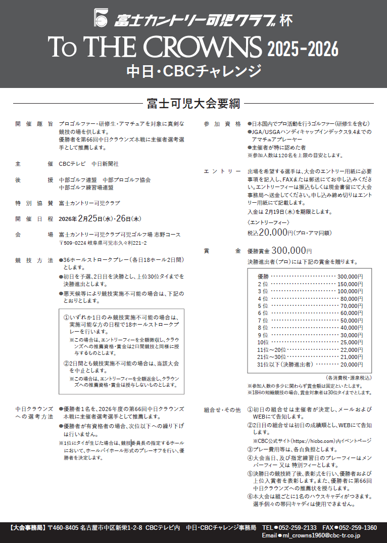 - 夢の和合へ!「富士カントリー可児クラブ杯 中日・CBCチャレンジ To THE CROWNS 2025-2026 」開催決定