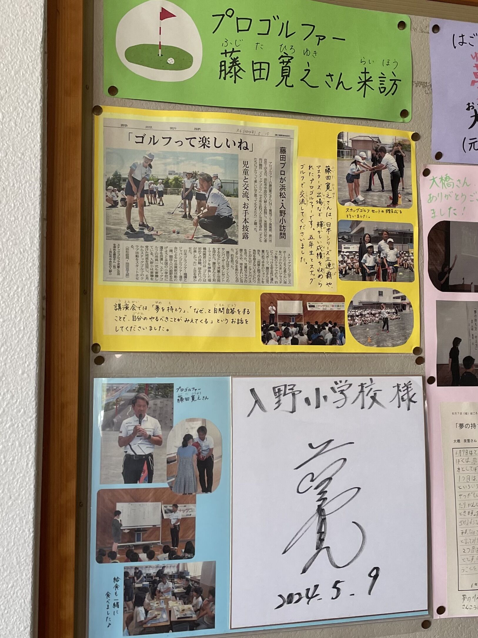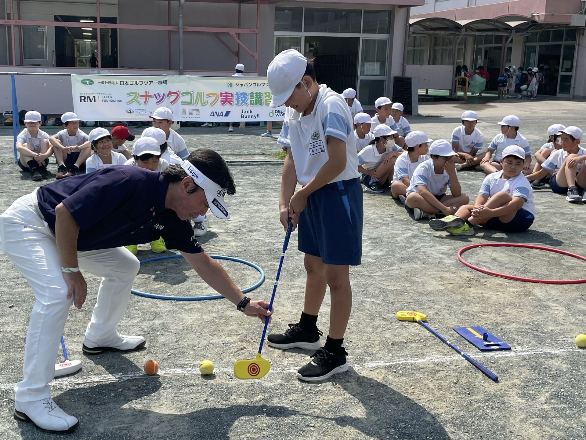 昨年5月に藤田寛之が訪問して以来、クラブ活動でのスナッグゴルフの学習が継続しており、その人気の高さから今年5月にも再度、実技講習会のリクエストがあり5年生81人を対象とした体験会が行われた。