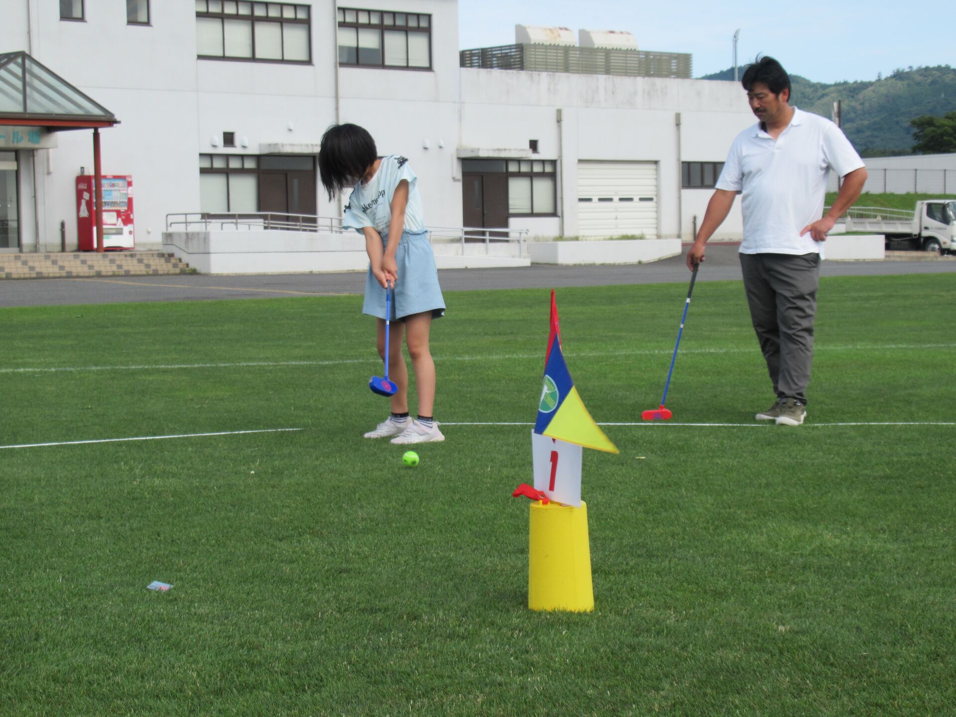 梅雨の時期ではあったが晴れ間に心地よい風が吹く中、親子で会話をしながらスナッグゴルフを楽しんでいる様子が見られた。