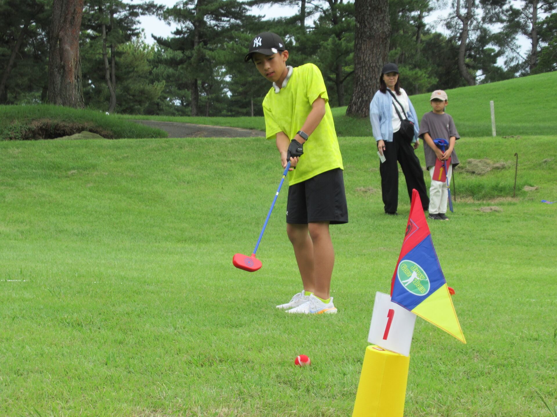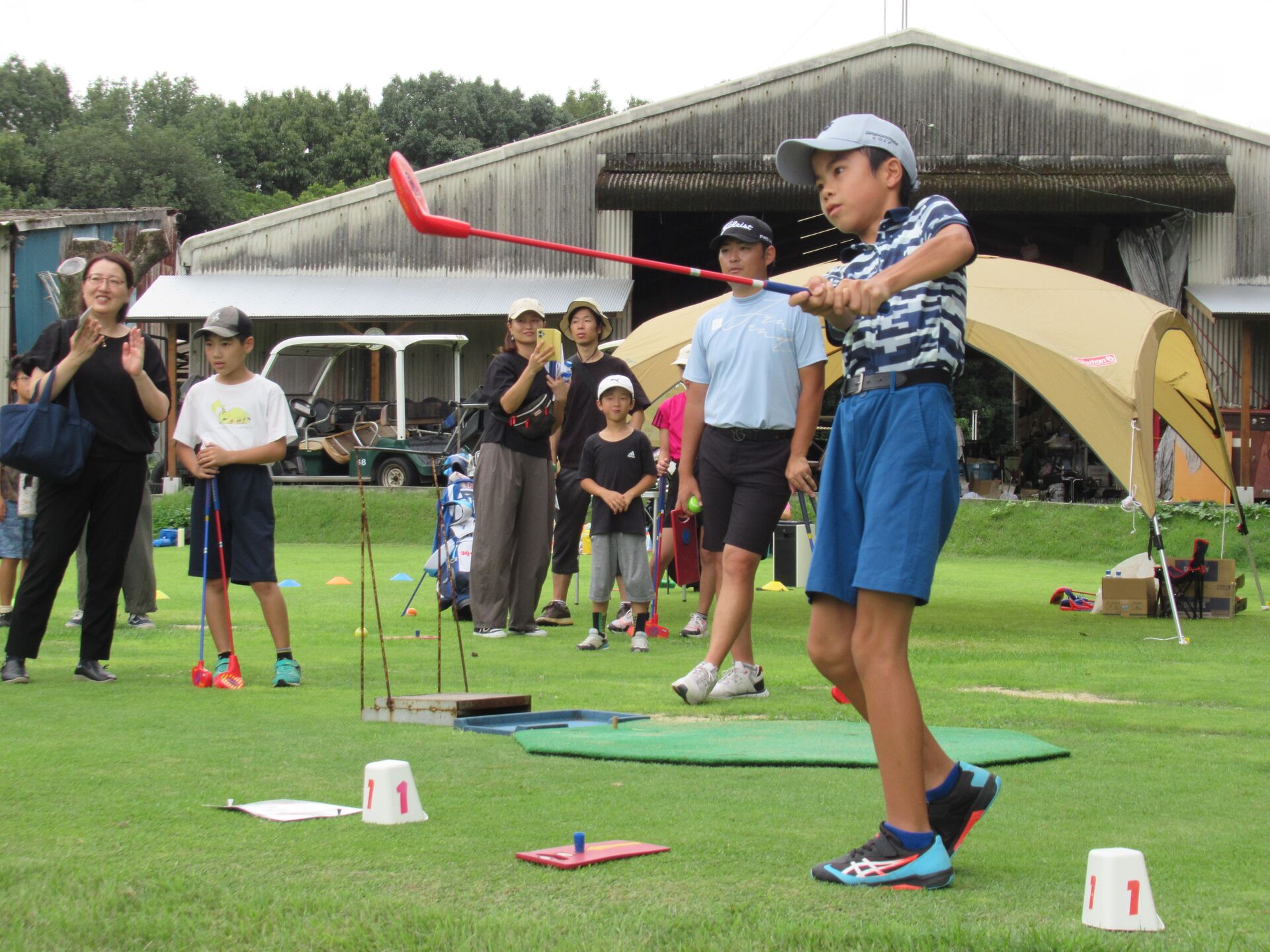 競技はドライビングレンジに特設された9ホールで競われ、合志市立西合志南小6年の柴田紳二郎くんが総合優勝に輝き、スペシャルゲストプロゴルファーの木下康平と井戸川純平からトロフィーの授与を受けた。