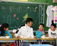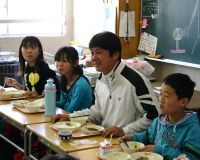 「いただきます!」野仲を囲んでの給食が始まった。お腹が空いているはずの子供たちだが、めったにないこのチャンス!野仲に聞きたかった事をそれぞれ質問しながら食事だ。