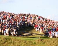 大きく右に吹かしたボールは、斜面で観戦する大ギャラリーのど真ん中に。