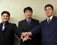 写真=新・会長の佐藤信人(=中央)は、広報事業担当理事職に就いた宮里聖志(=左)、同・谷原秀人(=右)とがっちり握手だ。