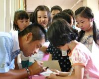 一通りのサインを終えて控室に戻った池田を待ち構えていたのは、今度は200名近くの低学年の子供達。この日、低学年の子供達は昼過ぎまでの授業で終了だったようで、池田が控室に戻ってくるのを待っていたのだ。