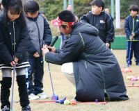 次にクラブを持ちかえてアプローチ、フルショットをそれぞれ練習。池田は10チームをくまなく回り、クラブの握り方、振り幅などを、手取り足取り丁寧に教えて回った。