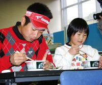 集合写真の記念撮影をした後は、施設内の部屋戻って、池田の所属先でもある日清食品の『どん兵衛』を、池田本人が“差し入れ”。