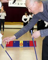 さっそくみんなでパターゲームに興じた。少し緊張がほぐれたころに、子供たちが演奏してくれたハンド・ベル。みんなで鑑賞したDVDは、谷口が昨年5月にツアー通算16勝目をあげた、日本プロゴルフ選手権の優勝シーンだ。