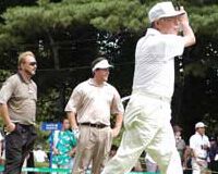 恒例のアマプロチャリティトーナメントでは、阪神タイガースのホームランバッター として18年前にチ ームを優勝に導いたランディ・バースさん、“大沢親分”こと大沢啓二さんとのプ レーを楽しんだ。「そのときは大沢さんには、“君はゴルフをしてればいいんだ”っ て叱られたんだけどね・・・(苦笑)」(ミケルソン)。