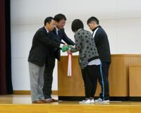 この日は、教育委員会表彰という、年に1回の特別な行事で、前半はスポーツや文化活動において、県レベルで3位以内、郡レベルで優勝など、顕著な実績のあった児童たちが教育委員会から表彰され、後半の贈呈式では、大山ゴルフクラブの酒井孝宏社長と、JGTO宮内勝業務部長から、代表児童へ用具の贈呈が行われた。