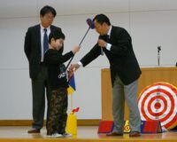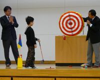 左手の親指に黄色いシール、右手の親指に赤いシールを貼り、グリップの握り方、スタンスのとり方、そして構え方を教わり、ローラー(パター)とランチャー(アイアン)で見事に的にくっつけると、全校児童から拍手の祝福を受けた。