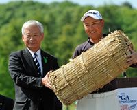 日清食品株式会社からいただいた「カップヌードル10年分(360食×10年分=3600食)」と、大会の地元は栃木県の那須烏山市の大谷範雄・市長から贈られた「那須烏山産こしひかり1 年分(180 キロ)」。