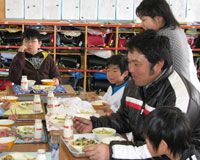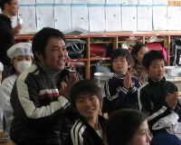 お腹をすかせているはずの子供達もめったとないこのチャンスにご飯そっちのけで小田に色々質問をなげかけながらの楽しい給食タイム。