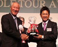 5冠に輝いた藤田。永久シード選手の青木功から、賞金ランキング賞のトロフィーを受け取る