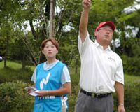 今年ファイナルQTの資格で参戦、プロ転向4年目の小川卓哉(=写真右)のバッグを 担ぐのは、妹で、弟子のあいさん(=同左)だ。あいさんは、女子プロゴルフ協会 会員のプレーヤー。日程のあいた週は、こうして師匠のバッグを担いで、修行をかね てアシストしているのだが、兄・卓哉は今年これまで予選落ちが続いている。ツアー 後半戦の出場チャンスを増やすためにも、そろそろ威厳を見せたいところだ。