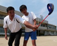 パット、チップショット、ピッチショット、フルショットの基本練習のあと、酒井プロと対戦を希望する代表児童2名をじゃんけんで決め、24ヤードのパー3という設定で試合が行われた。