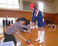 実技講習には6年生28名が参加し、香川県ジュニアゴルフ振興会の代表を務める増田能子プロの指導により、パット、チップショット、フルショットの基本指導が行われ、子どもたちの目線に合わせて笑顔で丁寧に指導した。