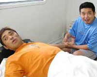 写真=フィットネスカーのヘッドトレーナー、成瀬克弘氏(=右)。現在、賞金ラ ンク2位の伊沢利光(=左)も、成瀬氏のマッサージに夢心地・・・(7月のトーナメン ト会場で撮影)。