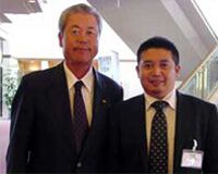 写真=プロアマ当日は、日本ゴルフツアー機構の島田幸作理事長(=左)も会場 で挨拶を済ませたあと、成瀬氏とパチリ。
