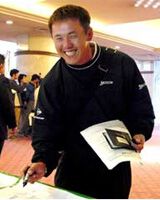 写真=プロアマ当日の朝、続々と会場入りする選手たち。記念のサインボードにサ インしているのは宮瀬博文。昨年、ひざの手術に踏み切った宮瀬だが、フィットネス カーのサポートで、すぐにツアー復帰を果たすことができたいきさつもある。