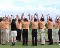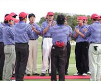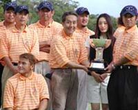 14対10で2年連続の7勝目をあげた東軍は、琉球ゴルフ倶楽部の18番グリーンでマス コットガールの仲間由紀恵さんから栄光の高松宮妃賜杯を誇らしげに受け取って、万 歳三唱(=写真中央)。