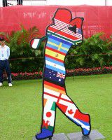 ★大会のティーマークには、ショットを打つお人形の体全体を出場各国の国旗が配されたものを使用している。写真はその巨大バージョン。日本の国旗はどこにあるかな?
