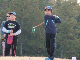 秋の快晴のもとで実施された大会は、ドライビングレンジに作られた9ホールの特設コースで行われ、打ち上げや打ち下ろしに加えて横傾斜など、技術とともに頭を使うセッティングで、打ち出すボールの距離感や方向性など、子どもたちはイマジネーションを膨らませて攻略した。