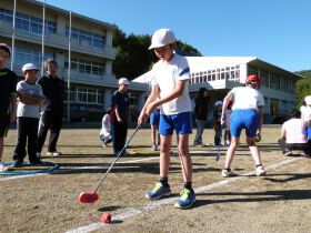 スナッグゴルフを学んだ児童たちは、「広いグラウンドで大きく打てて良かったです。」、「今日初めてゴルフをやってみて、マットを打ってしまったりしたけど、やっているうちに1回だけ遠くに飛ばせたので良かったです。」、「ゴルフ選手みたいな気分でした。チャレンジバトルが楽しかったです。」などの感想を発表した。