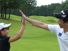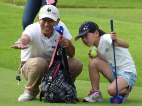 宍戸ヒルズ会場で優勝した、笠間市立友部小学校4年の綿引愛佳ちゃんはお爺ちゃんと参戦。愛佳ちゃんは表彰式で「優勝できて嬉しいです」と、副賞のジュニアクラブセットを抱えて喜びの笑みを浮かべた。
