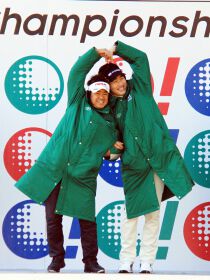 前日13日のプロアマ戦で首を痛めた近藤も、本番では再び元気に顔を揃えて、朝の開会式では午前中のダブルス戦で組む宮本が、“姫抱っこ”で歓迎。「初めての経験・・・。気持ち良かった」と、ムフフの近藤。「ミスを全部カバーしてもらった」と、感謝した宮本。女子の申ジエと酒井美紀選手に1打差をつけられた最後の9ホール目こそ近藤への“恩返し”のバーディで同点にこぎつけて、引き分けの2.5ポイントを死守した。