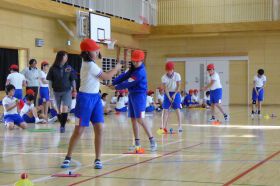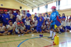 全校児童700人を超えるマンモス校での実技講習会は、1限目から6限目までをフルに活用して、更には1年生の見学も加わっての、全校あげての講習会となり、昨年新設されたばかりの広々とした体育館での講習ながら、ボール拾いでは四隅まで駆け回っての楽しい体験会となった。