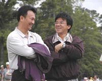 写真=昨年のマスターズトーナメント会場にて。本戦直前の水曜日。その年、一緒に遠征したアジアンPGAのバレン・タン氏(=左)とコース視察