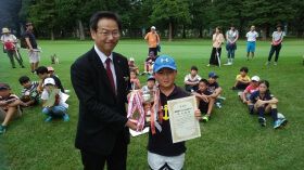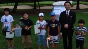 今年初めて参加した、小倉台小学校の3年生、辛宇振(シンウジン)君が2番ホールでホールインワンを達成するなど26ストローク10アンダーで回り2位に3打差をつけて、3年生ながら総合優勝に輝き、金瀬匡治支配人から総武CCカップを受け取った。