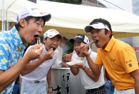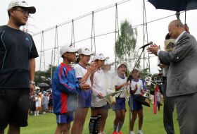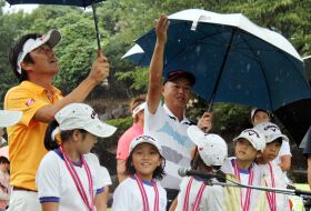 そして、大雨の表彰式で、優勝校のキャプテン小嶋蘭樹(こじまらんじゅ)さんが熱く優勝スピーチを語る間にも、そっと後ろから傘を着せかけてくれた心優しき6人のプロゴルファーのみなさん。