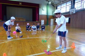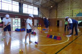 実は実技講習会は今日が初めてではなく、4月から就任した池田直哉校長は、3月までスナッグゴルフの普及定着率で全国トップレベルを誇る、茨城県笠間市の小学校から転任してきたばかりで、早速、スナッグ用具があることを知るやいなや、手作りのスコアカードを作成して、グラウンドで子どもたちとスコアを記録しての競技会を行ったそうで、前任校でも校庭にネットを張って練習エリアを確保して熱血指導を行ってきた実績の持ち主で、これからの活用が楽しみな小学校だ。