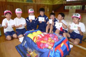 池田直哉校長の手作りスコアカードを手にする児童たち
