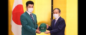 お土産に、サイン入りのマスターズのピンフラッグと帽子を菅首相に手渡し、「金メダルを目指して頑張ります」と、東京五輪への意気込みも語った。