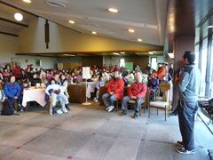 この日の朝のミーティングでも、トーナメントの最前線で支える「プロ」のボラン ティアさんたちから、プレーのペースなど、子どもたちへの指導ポイントについて意 見交換がされ、その意気込みが大会に浸透して「締りのある大会」を生んでいるよう だ。