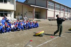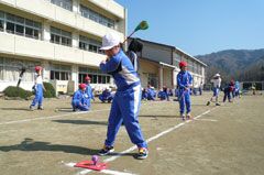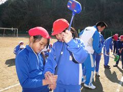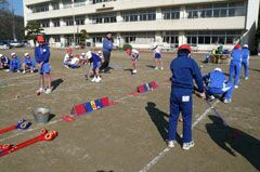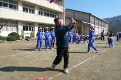 水府小学校での実技講習会は、2月とは思えぬ温かな天候の中、グラウンドで行わ れ、3年生から6年生の82名が参加した。