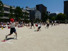 夏空のような眩しい晴天のもと、広島市立幟町小学校を倉本昌弘が訪れ、3年生70名 を対象に、スナッグゴルフを活用したゴルフ指導を行い、トーナメントのオープン ウィークに子どもたちと楽しいひと時を過ごした。
