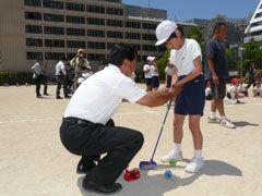 倉本昌弘が広島市立幟町小学校を訪問し子どもたちとスナッグゴルフを楽しむ(5月17日)