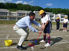 御前山小学校に導入された用具は、森ビル株式会社の継続的な支援により、昨年の「日本ゴルフツアー選手権宍戸ヒルズ」に おける社会貢献活動の一環として計画された、スナッグゴルフ・スクールセットの寄 贈・導入小学校のうち、静ヒルズカントリークラブ近隣の常陸大宮市、常陸太田市、 城里町に導入されたうちの一校で、常陸大宮市では2004 年10月の導入を皮切りに今回の導入で、市内13校の全てに導入されたことにな る。