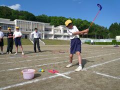 初夏の爽やかな晴天の下、スナッグゴルフを新たに導入した、常陸大宮市立御 前山小学校で実技講習会が行われ、4月より発足したばかりスナッグゴルフクラ ブ員5名と、運動クラブの18名の4年生から6年生23人が参加した。