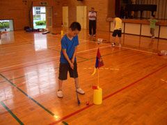 この日の実技講習会には、4年生から6年生の児童10名が集まり、高知県ゴルフ協会の 廣川智成事務局長の指導により、パット、チップショット、チップショット、フル ショットの実技指導を受けた後、ミニゲームで実践プレーも体験した。
