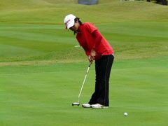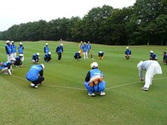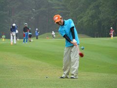 前日から降りだした雨はやむ気配がなく、大会の開催が心配され、前夜のミーティン グでは9ホールへの短縮なども検討されたが、大会当日の朝になると雨脚が弱まり、 何とか予定通りの時刻にティオフがされ、選手たちは緊張の面持ちながら、元気よく スタートを始めた。