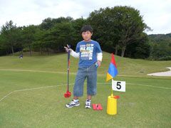 5年生の金子直樹くんは、5番ホール40ヤードのパー4で、ティショットを直接フラッ グにくっつけるホールインワン(アルバトロス)を達成し、試合を盛り上げた。