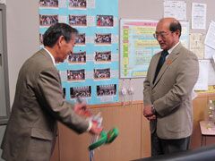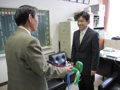 北広島市では、スナッグゴルフ対抗戦JGTOカップ全国大会における、社会貢献活動の 一環として、当機構からの寄贈計画により、市及び教育委員会を通じて導入され、 2006年は北広島市立西部小学校に1セットと教育委員会に1セットが、続く2007年は高 台、大曲、東部の3つの小学校が導入、そして今年、西の里小学校と緑陽小学校の2校 に各1セットが導入されることになり、北広島市教育委員会生涯学習部の川幡博行部 長から用具の贈呈が行われた。