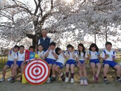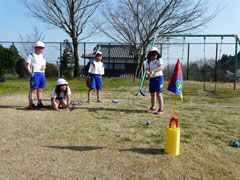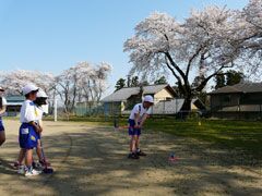 桜が満開の小春日和に、常陸太田市立瑞竜小学校の校庭で、4年生10名によるスナッ グゴルフ練習会が行われた。