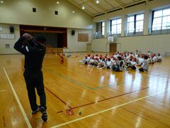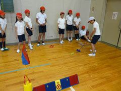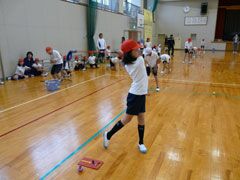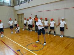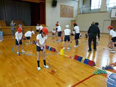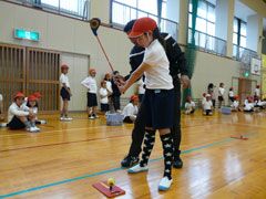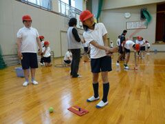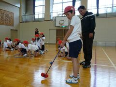 例年よりも早い梅雨入りの影響もあり、前日からの雨でグラウンドが使えず、体育館 で行われた講習会は、同県桑名市の酒井一也プロの指導により、5限目と6限目は児童 たち、そして放課後には先生方がスナッグゴルフを学んだ。
