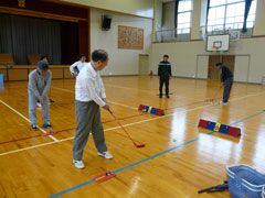 締めくくりに、体育館に特設した4ホールを、グループごとで実践ラウンドし、ゲー ムの仕方も学んだ。